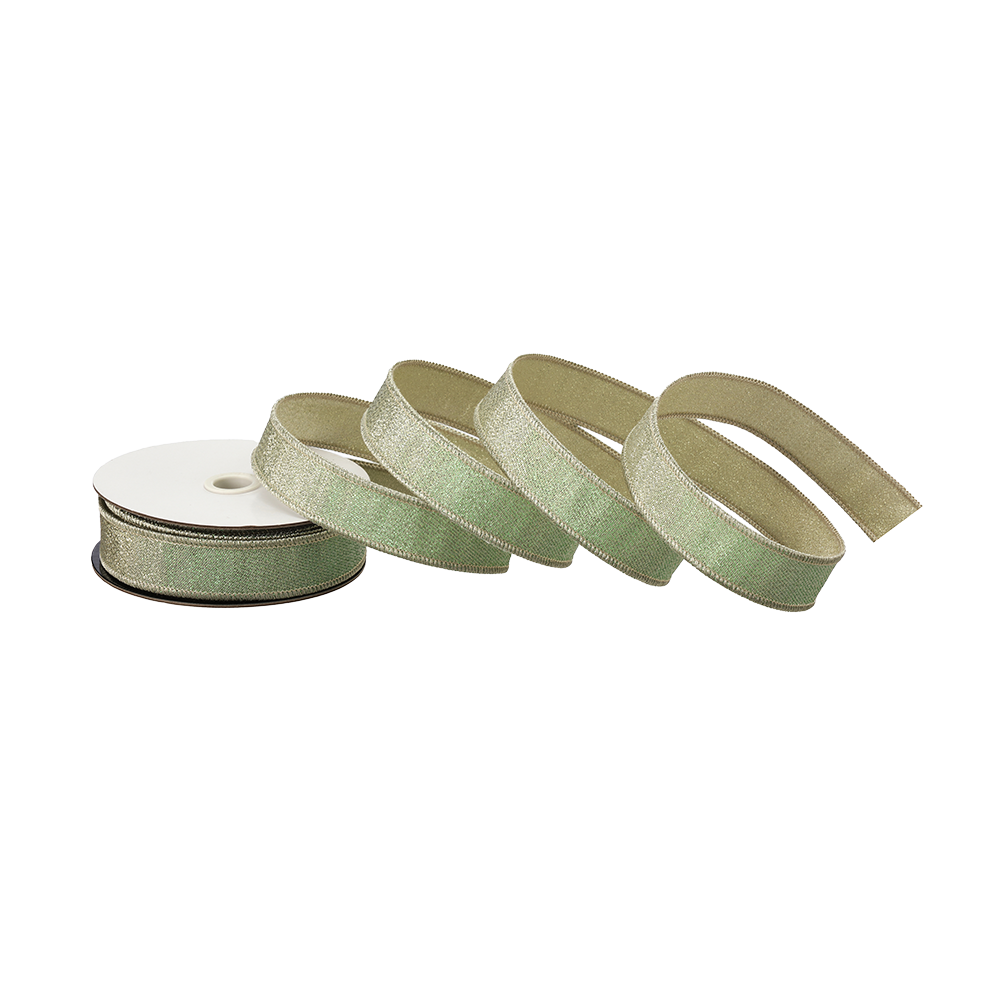 Dit pastelgroene metallic lint van Viv! Christmas is een frisse eyecatcher voor elke zoete kerstboom! De zachte mintgroene stof is jacquard geweven met goud metallic garen, waardoor het lint een subtiele glans krijgt en het goud op een verfijnde manier door het groen heen schittert. Ook aan de achterkant komt het gouden garen mooi naar voren, zodat je strikken en lussen er van élke kant feestelijk uitzien. Prachtig in een pastel Candyland-thema of als zachte tegenhanger in een modern, licht kerstinterieur.