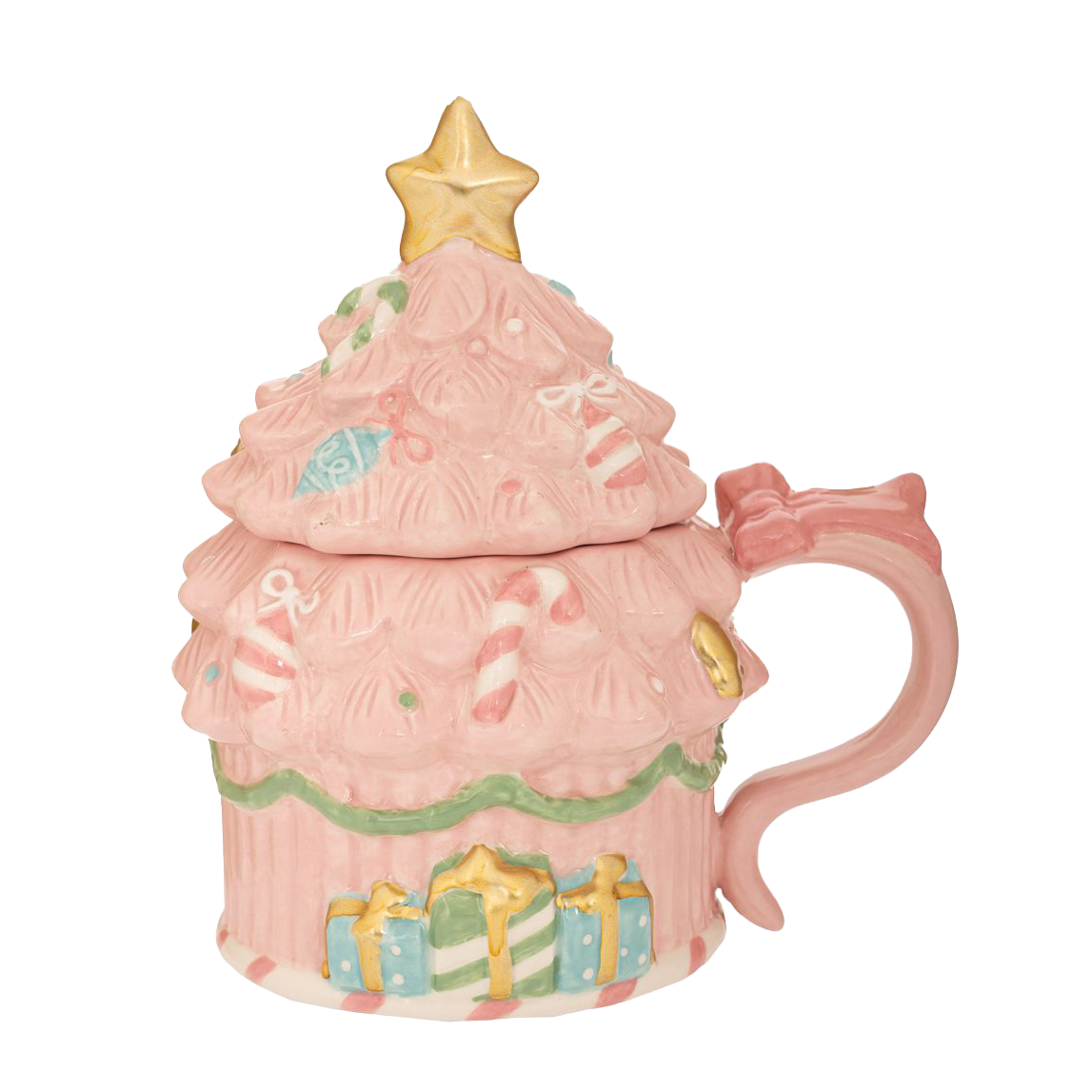 Zeg hallo tegen het zoetste kerstboompje in mokvorm! Deze Viv! Christmas kerstmok ziet eruit alsof hij zo uit een suikerspinnen-winterwonderland is gerold. Van zuurstokdetails en fonkelende kerstballen tot een strikvormig oor en cadeautjes aan de voet — elk detail ademt zoete kerstvreugde. De deksel? Die is natuurlijk bekroond met een gouden ster, helemaal klaar om te schitteren in jouw kerstcollectie.