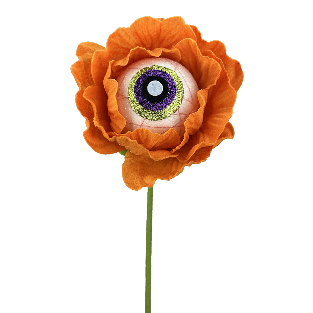 Deze oranje bloem lijkt op het eerste gezicht onschuldig… tot je merkt dat ze terug staart. Midden in de fluwelige bloemblaadjes prijkt een glinsterend oog, compleet met paarse iris en fonkelende details. Een perfect accent voor je Halloweenboeket of guirlande: net creepy genoeg, maar zonder de glamour uit het oog te verliezen.