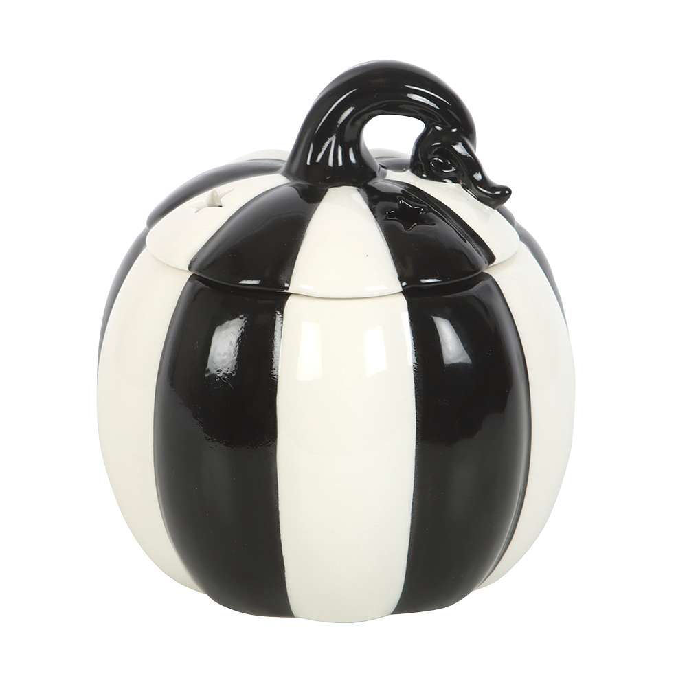 Een oliebrander met een tikkeltje gothic glamour! Deze zwart-wit gestreepte pompoen zou zó op het dressoir van Wednesday Addams kunnen staan. Elegant, mysterieus én perfect om je favoriete herfstgeuren te verspreiden. De sierlijk gekrulde steel en uitgesneden stervormige oogjes zorgen voor een betoverend lichteffect zodra je er een theelichtje in plaatst.