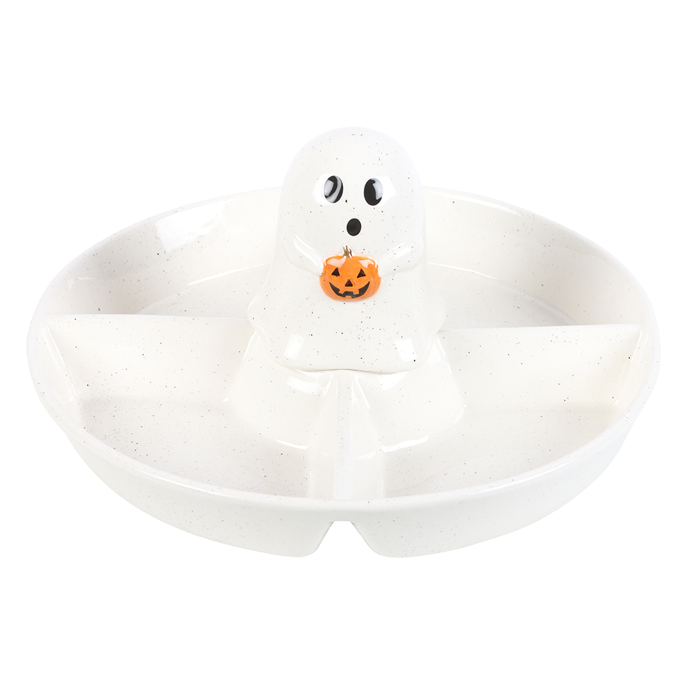 Snacken met een spookje! Deze keramieken chips & dip schaal maakt jouw Halloween compleet. In het midden staat een schattig spookje met pompoenemmer — klaar om je snacks te bewaken (of stiekem mee te snoepen). De schaal heeft vijf handige vakken voor chips, groente, snoep of nootjes, en een centraal dipbakje dat perfect is voor guacamole, salsa of karamel!