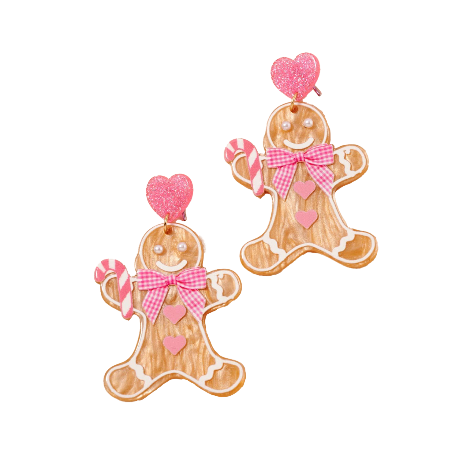Viv! Christmas Kerst Statement Oorbellen - Roze Gingerbread Man met Strik