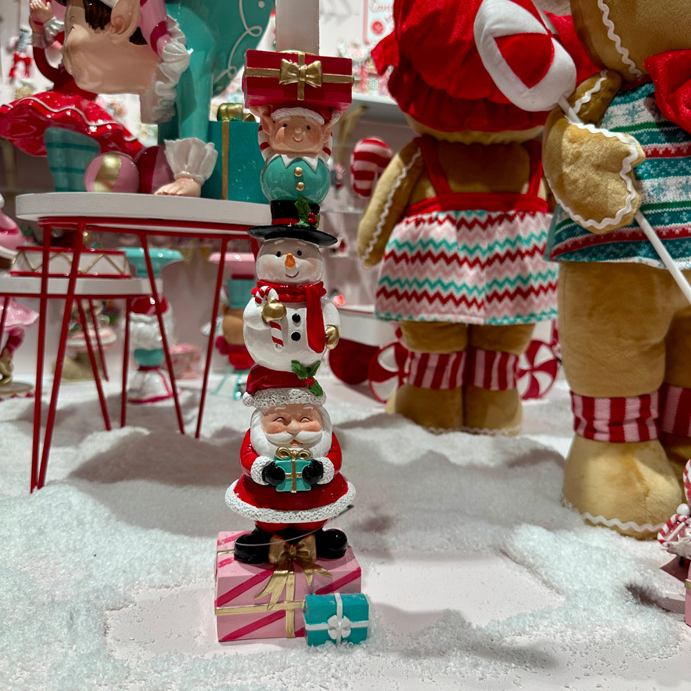 Wanneer de kerstman het niet alleen redt, springt de rest van het kerstteam in. Deze vrolijke kandelaar van Viv! Christmas laat zien hoe een goede samenwerking eruitziet: de kerstman houdt alles stabiel op een stapel cadeaus, de sneeuwpop klimt vol enthousiasme omhoog met een zuurstok in zijn hand, en de elf bovenop houdt een cadeau in de lucht – dat direct dienstdoet als als houder voor een dinerkaars.