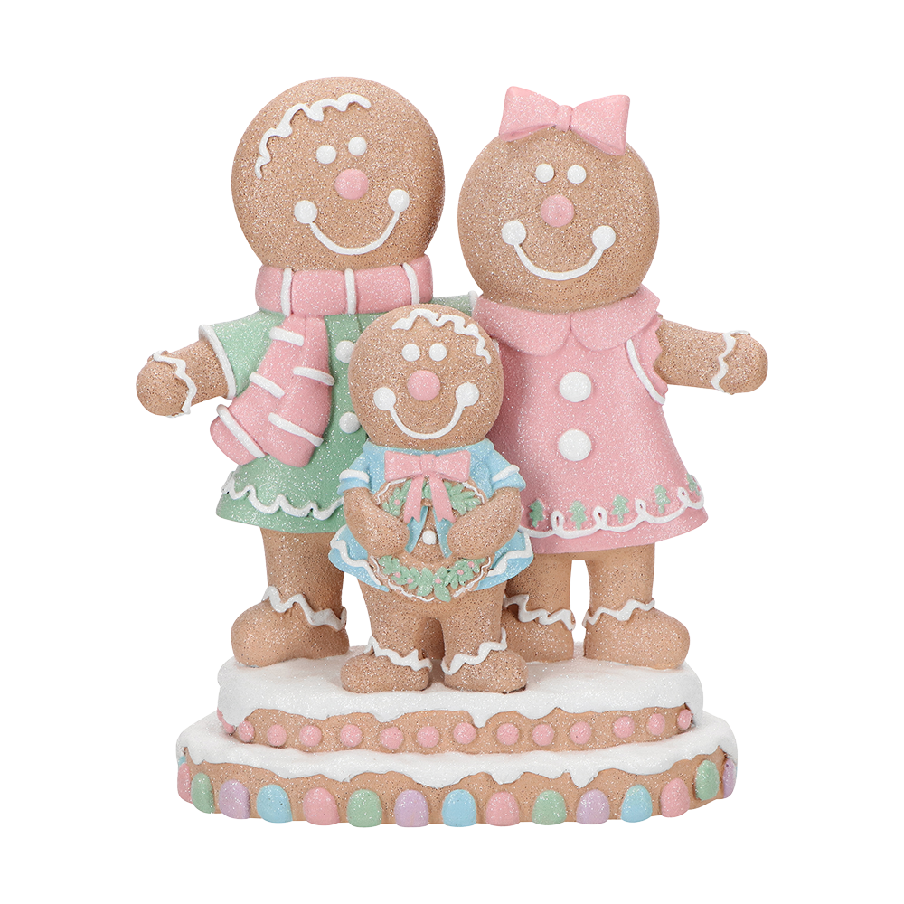 Papa met zijn sjaal, mama met haar strik en het kleintje met een kerstkrans in de hand: samen staan ze stevig op een feestelijk voetstuk van sneeuw en gekleurde snoepjes. Met hun glitter afwerking en zorgvuldig uitgewerkte details zijn ze perfect als blikvanger op tafel, in een kerstdorp of op de vensterbank. Ze maken van elke plek een klein Candyland – zó lief, zó zoet, zó kerst!