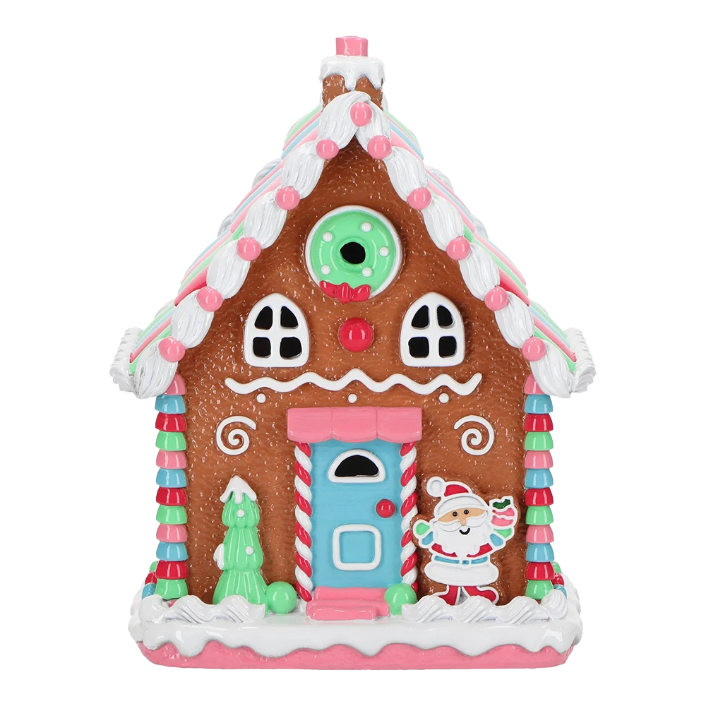 Viv! Christmas Kerstbeeld - Gingerbread Huis met Kerstman incl. LED Verlichting - roze rood blauw groen - 25cm