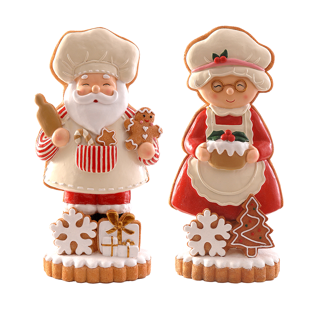 Deze betoverende set van twee kerstbeelden van Viv! Christmas toont het meest geliefde bakduo van de Noordpool in volle actie. Meneer Claus staat paraat met zijn deegroller en zakken vol gingerbread koekjes, terwijl mevrouw Claus trots haar versgebakken kerstpudding presenteert. Met hun peperkoek-achtige look, glazuurdetails en klassieke rood-witte outfits, zijn ze net zo verrukkelijk als de lekkernijen die ze maken. Zet deze exclusieve kerstdecoraties – die slechts in beperkte oplage beschikbaar zijn – op een dressoir, vensterbank of in de keuken voor een heerlijk feestelijk bakfestijn in huis!