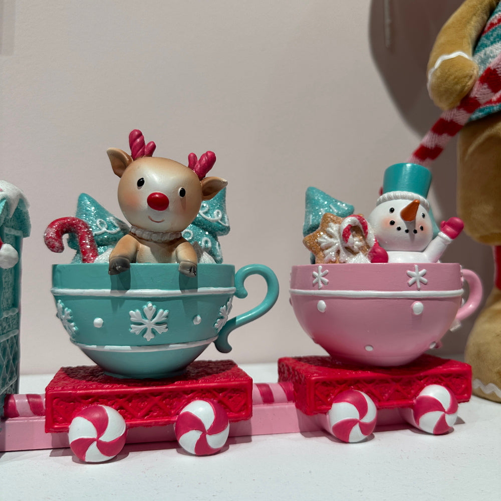 Stap aan boord van de sweetest ride of the season! Deze betoverende gingerbread kersttrein van Viv! Christmas is niet zomaar een trein – het is een rijdend feestje vol kerstmagie, snoepjes en vrolijke passagiers. In de kleurrijke theekop-wagons zitten niemand minder dan een schattig rendier, een vrolijke sneeuwpop én een hele lading kerstkoekjes. De locomotief, bestuurd door de kerstman, rijdt op pepermuntsnoep-wielen en is versierd met glazuur, suikergoed en vrolijke pastelkleuren.