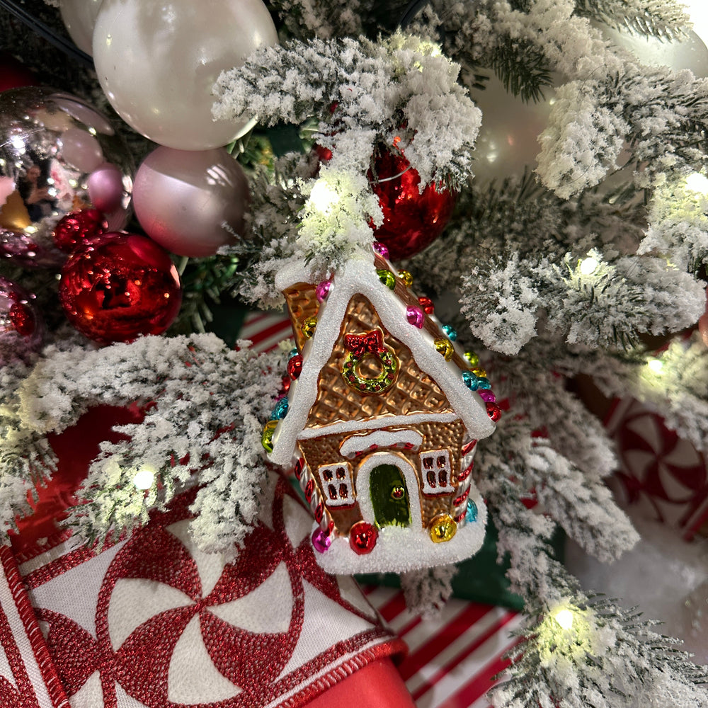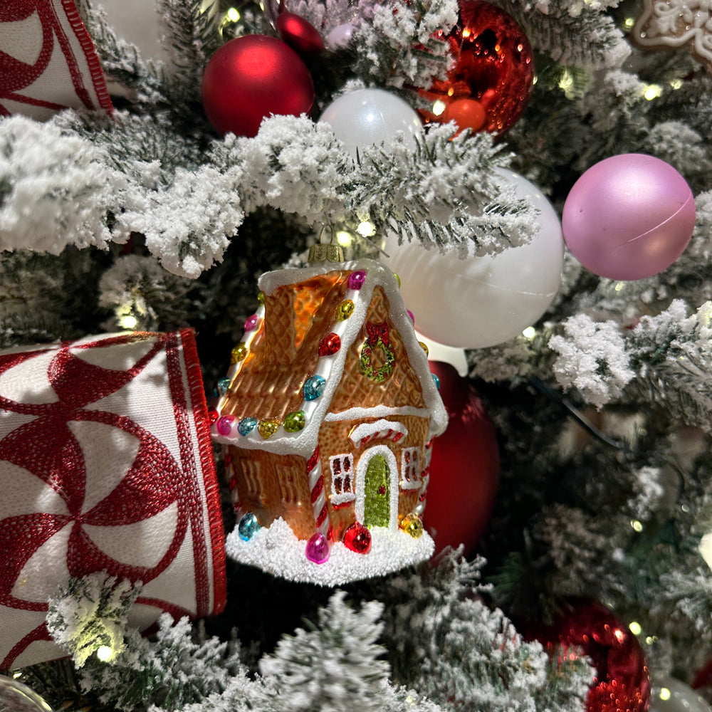 Je zou bijna aankloppen om te vragen of er nog plek is aan de kersttafel. Dit glazen gingerbread huis kerstornament van Viv! Christmas is tot in de puntjes versierd: van het glinsterende dak tot de kleurrijke kerstlampjes, de zuurstokranden en de besneeuwde ondergrond die eruitziet alsof hij nét vers is gevallen. Zelfs de groene voordeur is voorzien van een subtiele glitterglans – klaar om in je boom te schitteren.