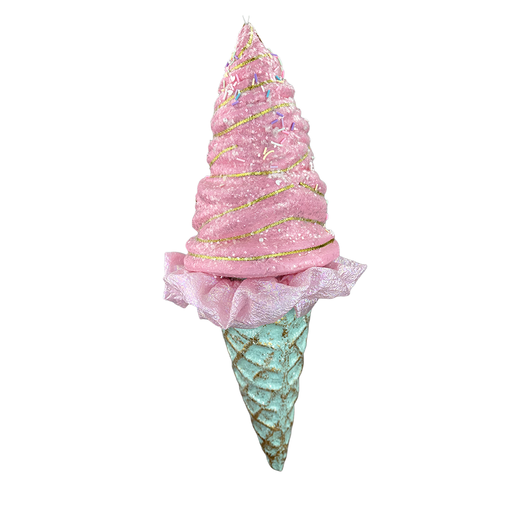 Dit bijzondere ornament is rechtstreeks overgevlogen uit Amerika, waar kerstversiering gerust een maatje (of drie) groter mag zijn. De royale ijs-swirl is bezaaid met glitter, een gouden spiraal en confettistrooisel, terwijl het mintgroene wafelhoorntje is afgewerkt met een feestelijke rucherand in pastelroze.