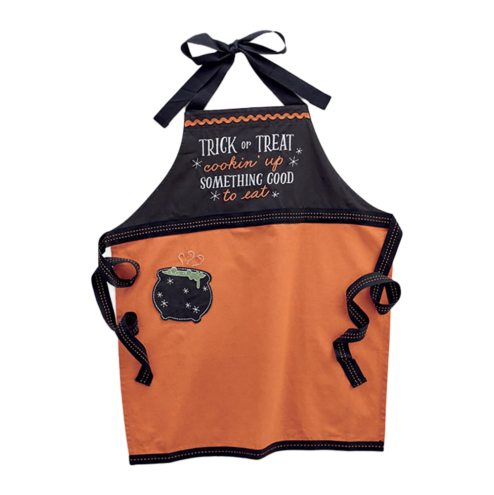 Het schort is gemaakt van stevig katoen en heeft een klassiek Halloweendesign: zwart bovenin met geborduurde tekst “Trick or Treat – cookin’ up something good to eat” en een feloranje onderzijde met zwarte bies. De absolute blikvanger? De speelse ketelvormige zak met een vleugje groene toverdrank die net over de rand bubbelt. Met een afmeting van 84 x 72 cm past hij ruim en comfortabel, en tover je jezelf zo om tot de stijlvolste heks of warlock van de keuken. Exclusief verkrijgbaar bij Viv! Christmas in Europa — maar pas op: voor je het weet wordt er van je verwacht dat je écht iets lekkers maakt.